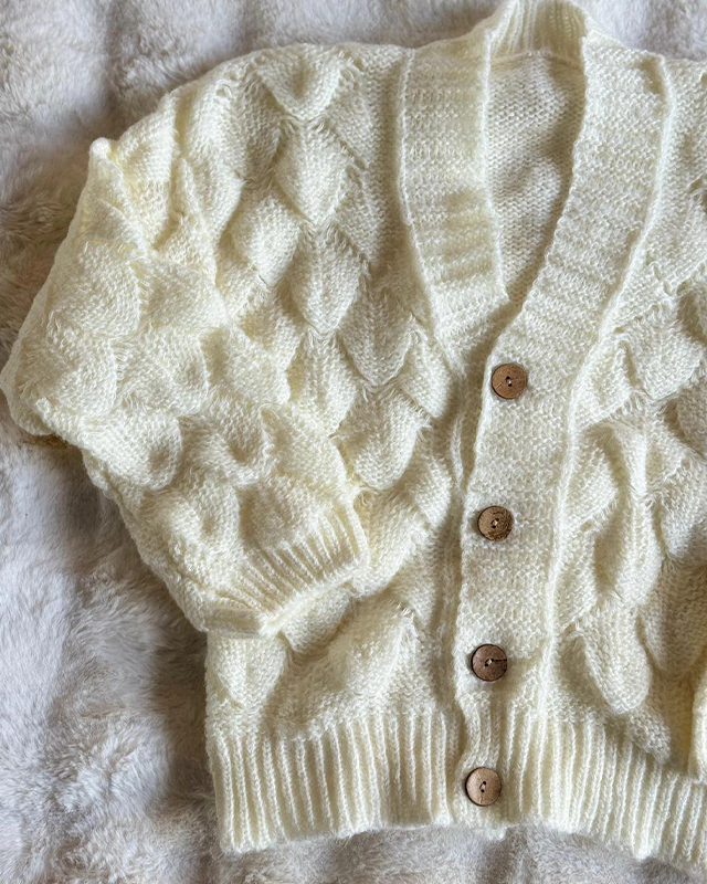 Este cardigan corto de frizz con textura escamada y tres botones combina diseño original con un toque sofisticado.