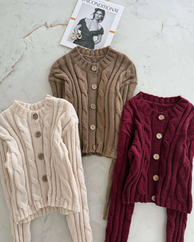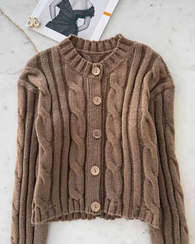 Cardigan tejido con diseño de trenzas y escote redondo. Posee botones de coco que le aportan un detalle rústico y original. De largo corto, ideal para usar con jeans o faldas de tiro alto. Su calce es ajustado al cuerpo sin perder comodidad.