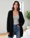 Un saco largo abierto de frizz con un tramado ondulado que aporta un toque de elegancia y confort a tu guardarropa. Su diseño contemporáneo con corte oversize se adapta a diferentes estilos y tallas.
