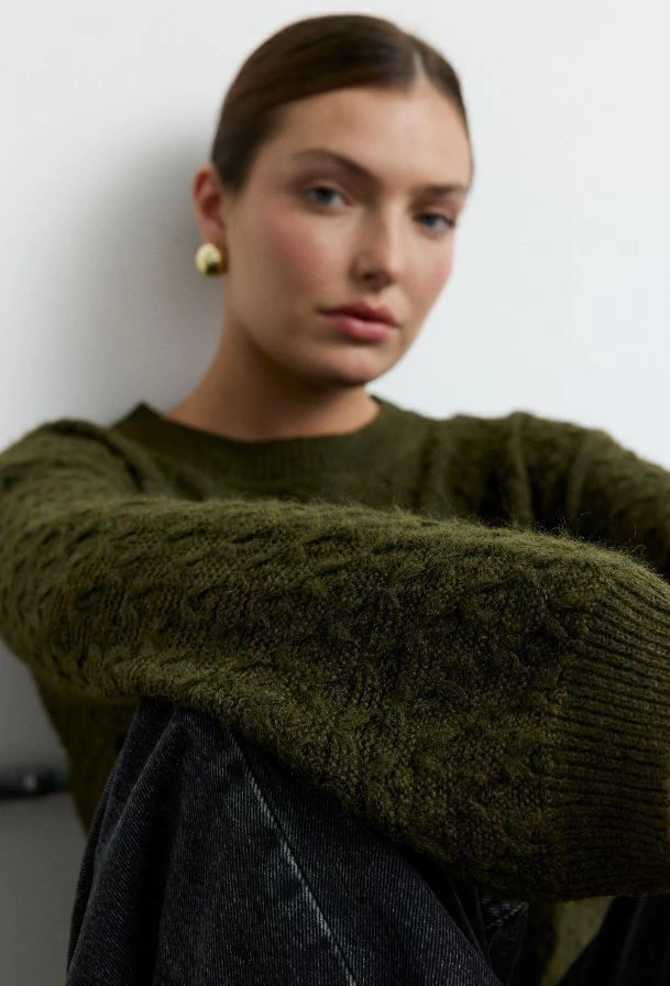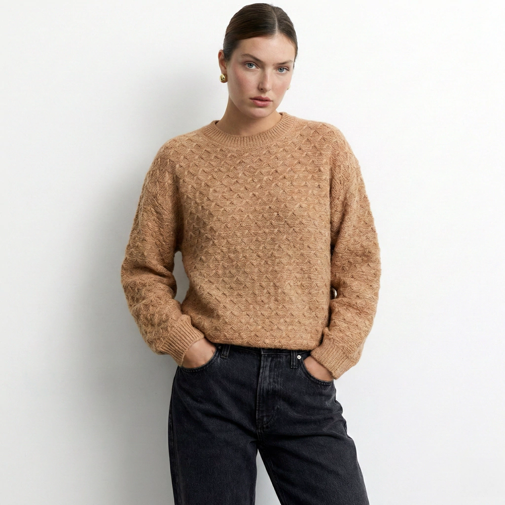 Descripción: Sweater tejido de trama geométrica en hilado suave, con cuello redondo clásico y mangas largas. De calce relajado y textura agradable al tacto. Ideal para usar solo o en capas durante los días frescos.