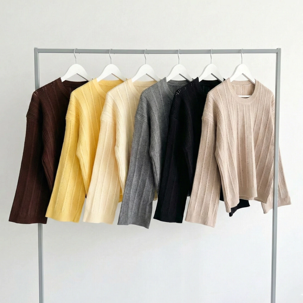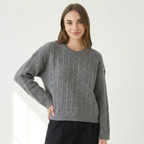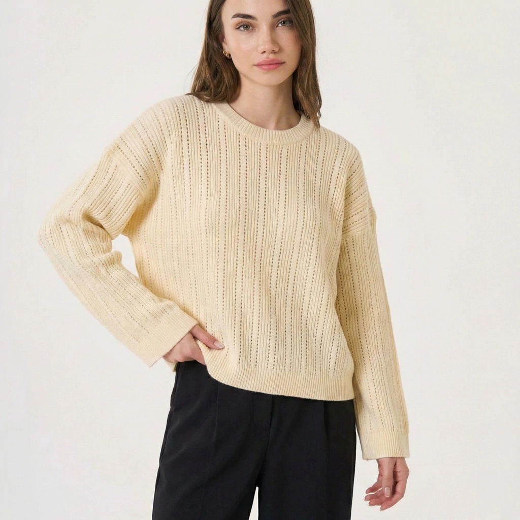 Descripción: Sweater de punto calado con textura morley y tejido en dos cabos, de estructura firme y peso medio. Diseño recto con mangas amplias y caída relajada. Ideal para looks neutros con textura protagonista.