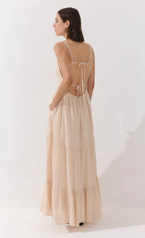 Descripción: Vestido largo de seda con bolsillos laterales, breteles finos y tiras ajustables en la espalda. Forrado, fluido y elegante.